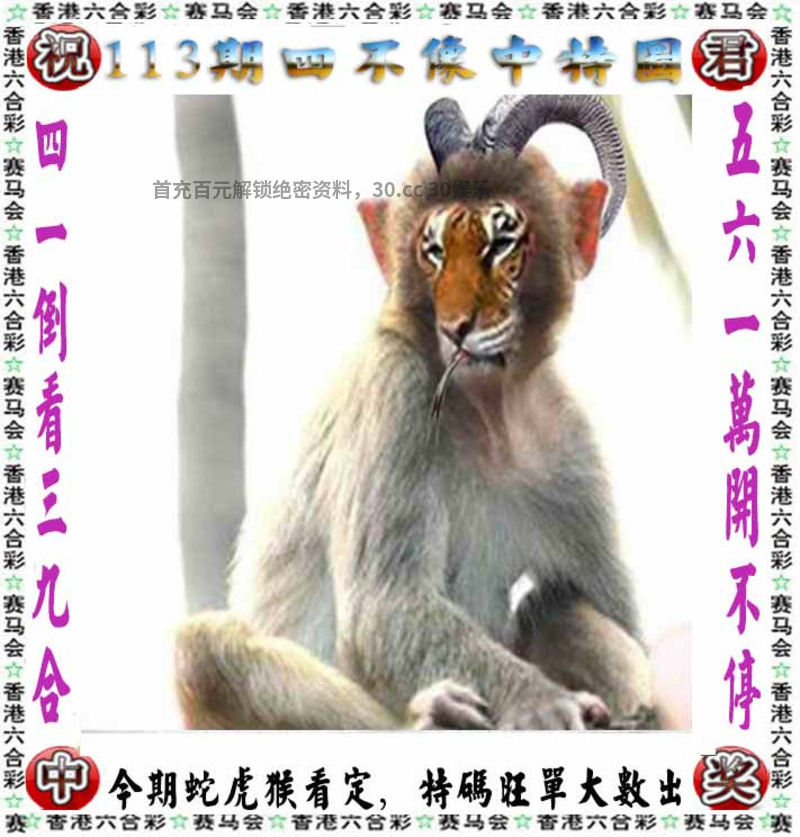 113期:开蛇13准 ①绝杀三肖:马狗鸡 ②解六肖:蛇虎猴牛猪龙 |